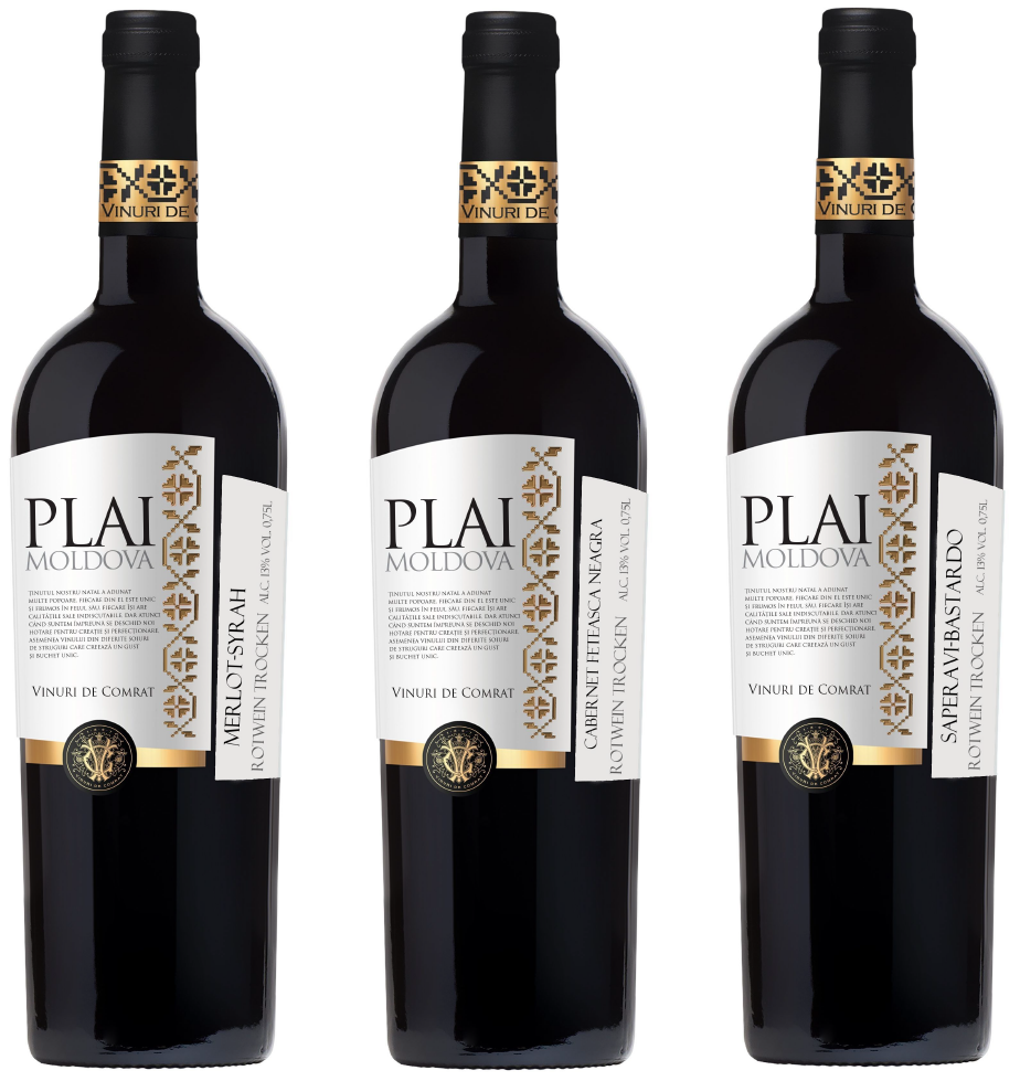 Das 3er-Promo Set  „PLAI“- beinhaltet 3 trockene Reserveweine des Jahrgangs 2017, die im Süden Moldawiens aus ausgewählten Trauben hergestellt sind. Eine ideale Region für die Rotweinproduktion. Der Wein reift 6 Monate in französischen Eichenfässern und hat eine elegante rubinrote Farbe.