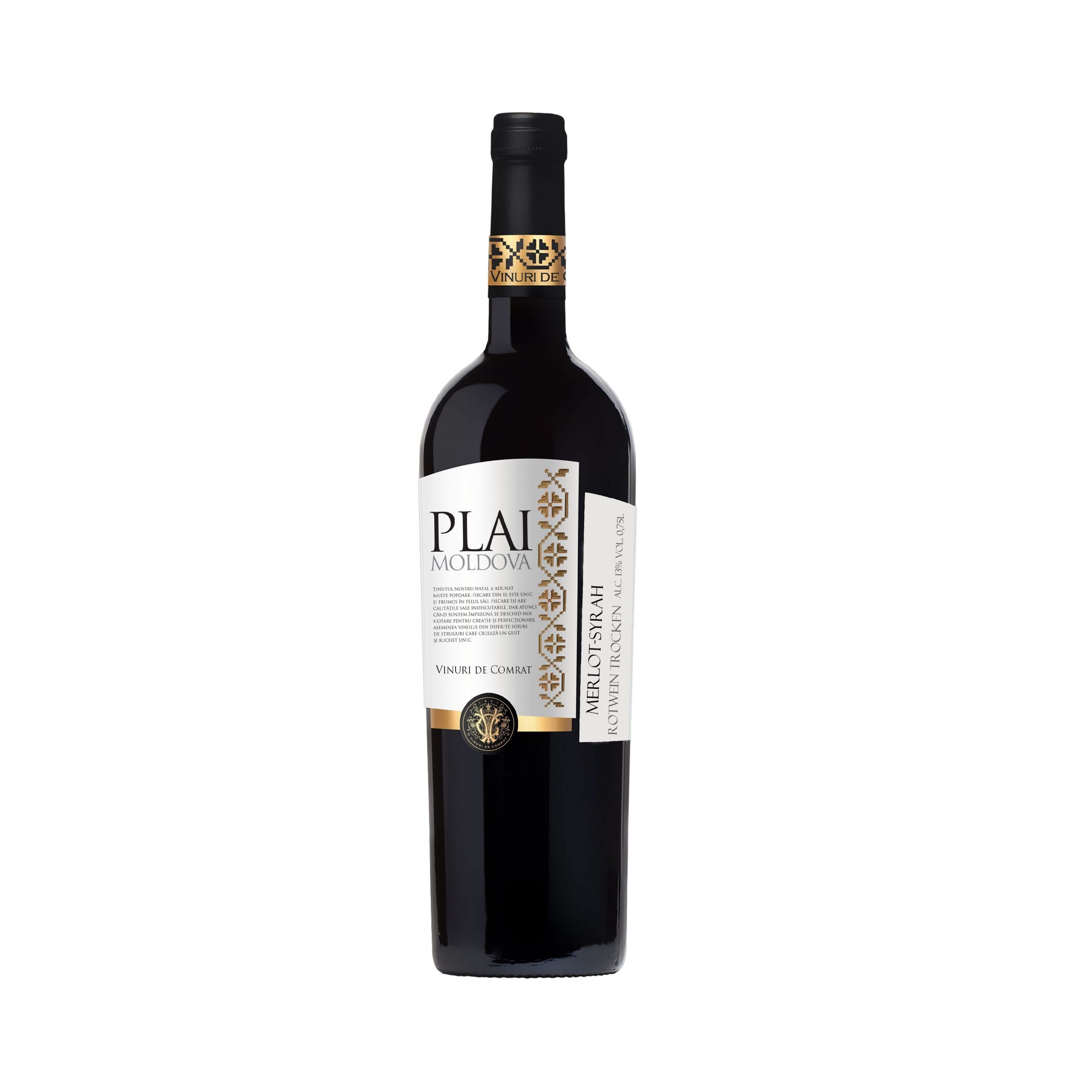 Der Wein PLAI Merlot Syrah ist ein trockener Reserve-Wein von Jahrgang 2017, aus Moldawien.  Es wird aus den ausgewählten Trauben Merlot und Syrah hergestellt, die im Süden der Republik Moldau angebaut werden. Ideale Region für die Herstellung von Rotwein. Der Wein wird 6 Monate lang in französischen Eichenfässern gereift und besitzt eine elegante rubinrote Farbe.